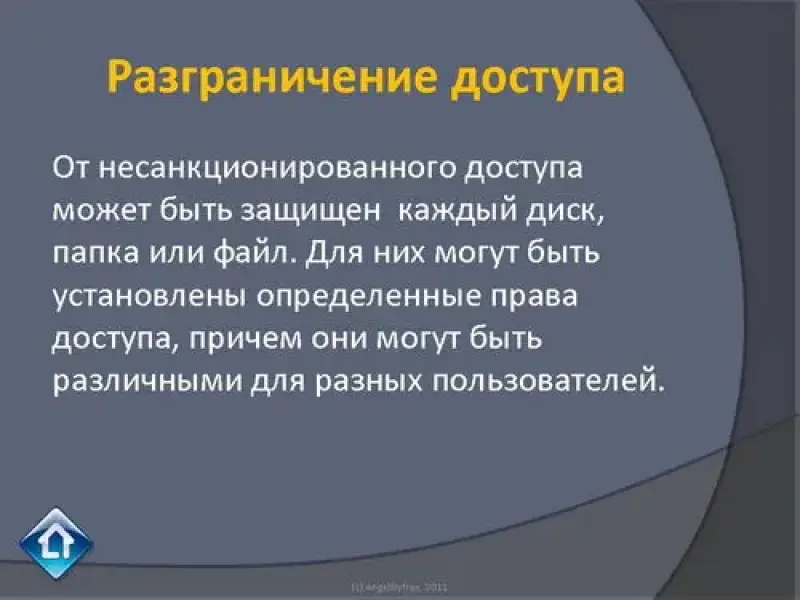 От несанкционированного доступа может быть защищен каждый диск, папка или файл. Для них могут быть установлены определенные права доступа, причем они могут быть различными для разных пользователей.