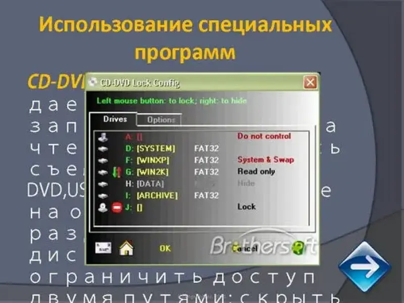 CD-DVD Lock - программа дает возможность запретить доступ на чтение или на запись съемных дисков - CD, DVD,USB, дискет, а также на определенные разделы жестких дисков. Можно ограничить доступ двумя путями: скрыть ваши устройства от возможности просмотра или закрыть к ним доступ.