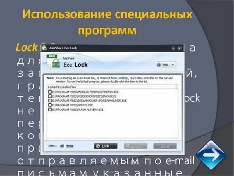 Lock 2.0 - предназначена для блокирования запуска приложений, графических и текстовых файлов. Lock не позволяет также перемещать, копировать и прикреплять к отправляемым по e-mail письмам указанные файлы. Что может существенно ограничить доступ к Вашей информации посторонним лицам.