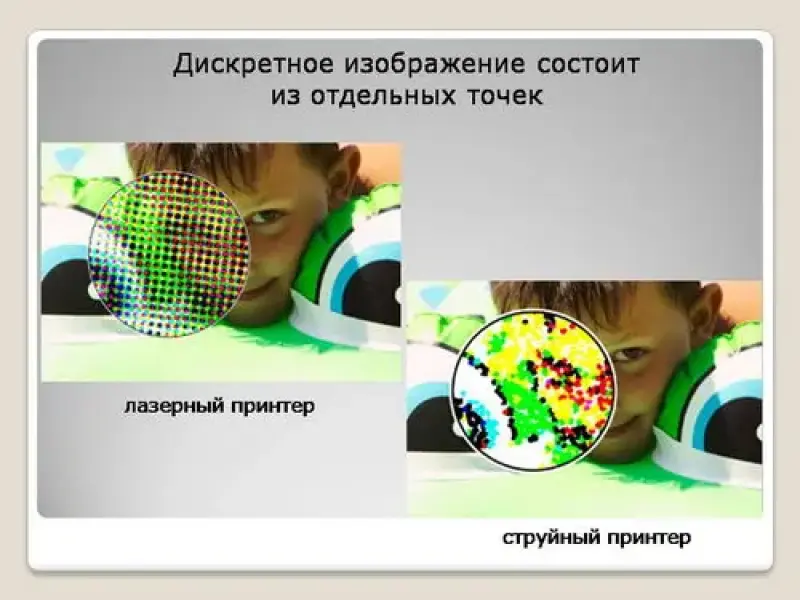 Что вы понимаете под "графической информацией"? (фотографии, рисунки, картинки). Давайте разберемся в какой форме может быть представлена графическая информация. Существует две формы представления - аналоговая и дискретная (слайд 2). Примером аналоговой формы может служить живописное полотно, цвет которого изменяется непрерывно (слайд 3). Дискретное изображение состоит из отдельных точек. Примером может служить изображение, распечатанное на принтере (слайд 4). Преобразование изображения из аналоговой (непрерывной) в цифровую (дискретную) форму, называется пространственной дискретизацией (слайд 5). Пространственную дискретизацию изображения можно сравнить с построением мозаики. Изображение разбивается на отдельные фрагменты, точки (пиксели) (слайд 6). Думаю, все вы не раз наблюдали такую картину при увеличении изображения на экране монитора или в сотовом телефоне (слайд 7). Пиксель - это минимальный участок изображения, для которого независимым образом можно задать цвет. В результате пространственной дискретизации графическая информация представляется в виде растрового изображения.