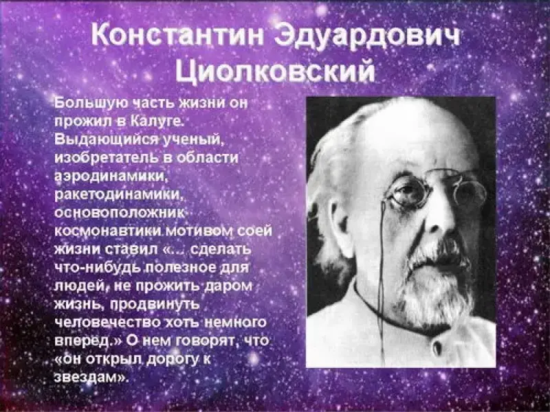 Говоря об этом дне, нельзя не вспомнить о великом ученом и изобретателе К, Э. Циолковском. (слайд 2) Большую часть жизни он прожил в Калуге. Выдающийся ученый, изобретатель в области аэродинамики, ракетодинамики, основоположник космонавтики мотивом соей жизни ставил ": сделать что-нибудь полезное для людей, не прожить даром жизнь, продвинуть человечество хоть немного вперед." О нем говорят, что "он открыл дорогу к звездам".