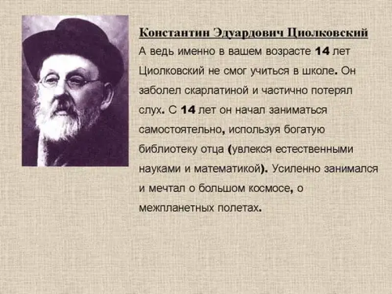 А ведь именно в вашем возрасте 14 лет Циолковский не смог учиться в школе. Он заболел скарлатиной и частично потерял слух. С 14 лет он начал заниматься самостоятельно, используя богатую библиотеку отца (увлекся естественными науками и математикой). Усиленно занимался и мечтал о большом космосе, о межпланетных полетах.
