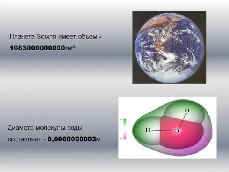 Например, известная нам планета Земля имеет объем - 1083000000000 км3, а если посмотрим на малую величину диаметра молекулы воды - 0,0000000003 м.(слайд 6).