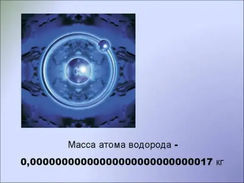 - Масса атома водорода - 0,00000000000000000000000000017 кг (слайд 15).
