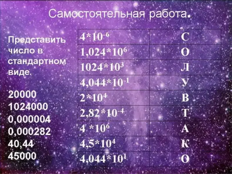 4*10-6 С 1,024*106 О 1024*103 Л 4,044*10-1 У 2*104 В 2,82*10-4 Т 4 *106 А 4,5*104 К 4,044*101 О