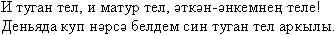 Татарский язык очень мелодичен. Особую музыкальность языку придают дополнительные буквы, богатые оттенками звучания: твердые и мягкие, длинные и короткие. Их чередование делает звучание языка очень музыкальным, а мелодия всегда естественно передает "музыку" языка.
