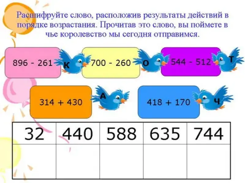 Слайд 3. Решив данные примеры и расположив ответы в порядке возрастания, вы узнаете, в чье королевство мы сегодня отправимся за новыми знаниями.