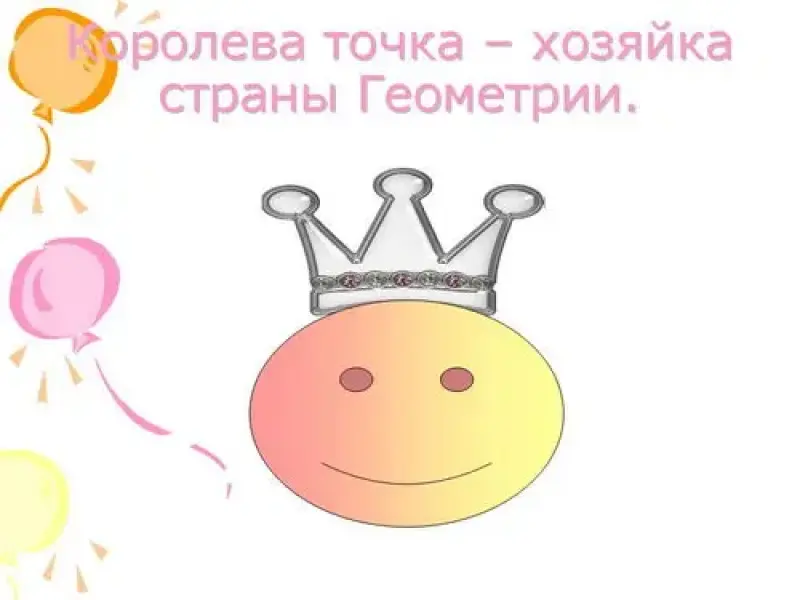 Слово учителя: Сегодня мы отправимся в увлекательное путешествие по стране Геометрии. Встречает нас здесь королева этой страны, без которой невозможно построить ни одной фигуры, это Точка (Слайд 5).