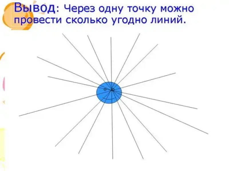 № 1. Откройте тетради. Обозначьте точку. Сколько можно провести прямых через данную точку? (Слайд 14) Какой можно сделать вывод? Вывод: через одну точку можно провести сколько угодно прямых.