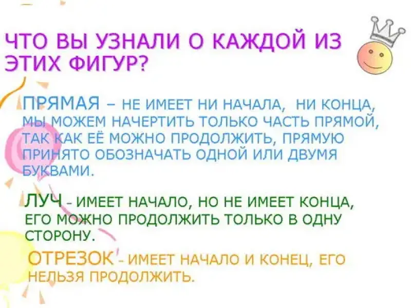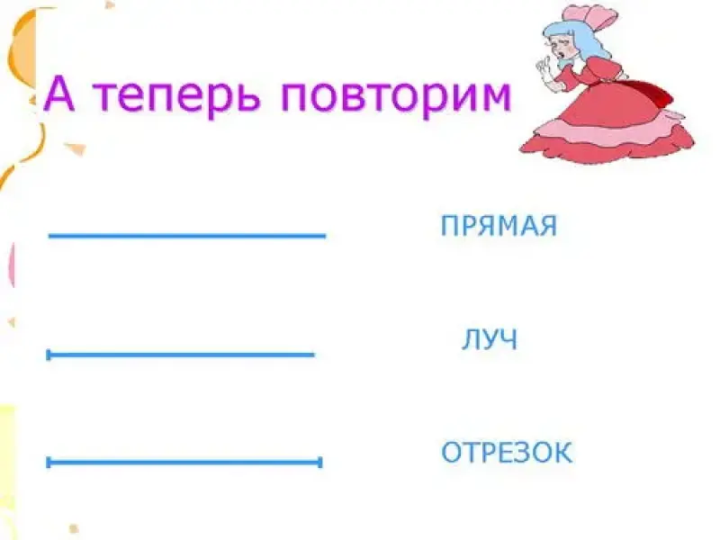 - Закрепить представления о понятиях "прямая", "луч", "отрезок";