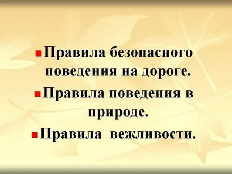 Учитель: Таким образом, существует много правил поведения. Мы рассмотрели наиболее важные для нас. Это правила поведения в природе, вежливости, безопасного движения на дороге. Можно знать много правил поведения. Но самое главное соблюдать их. Знание и соблюдение правил поведения помогает нам в жизни поддерживать порядок.