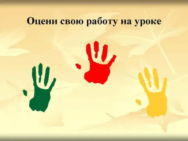 Обведите свою ладошку. Если вы, считаете, что вы работали хорошо, раскрасьте красным цветом, если не все получилось - зеленым, если ничего не получилось - желтым ( слайд 21).