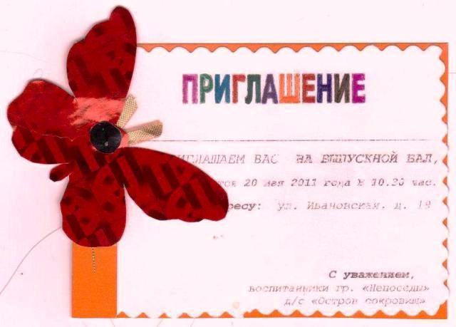 Оборудование: конверты «Выпуск-2011» (лицевая часть конверта); «Победителем в номинации ... объявляется» (тыльная часть конверта); на листе А-4 в конверте написаны фамилия и имя ребенка победителя в номинации; стулья именные для детей и взрослых; два стола для подарков (столы подписаны для каждого ребенка); фигурки «Ника» (премия «Выпуск-2011»); памятные подарки - глобусы; колпачки для танца «Буратино»; букеты цветов для преподавателей; метелки для танца «Бабки-Ежки»; папки для детей ведущих (4 штуки); веера для танца «Японский»; маски-шапки для подтанцовки к песне «Новогодние игрушки»; свечи для торта; цветы-подсолнухи для подтанцовки к песне «Выглянуло солнышко»; микрофоны; гелевые шарики для запускания в воздух (загадывание желания); благодарственные письма родителям (приложение 1); праздничный торт; праздничные пакеты (для фотографий, рисунков выпускников и т.д.); ростовые куклы для подтанцовки к песне «Детский сад - волшебная страна»; чалма, подушечки для танца «Восточный»; подарки для малышей; открытка-приглашение для гостей (приложение 2).