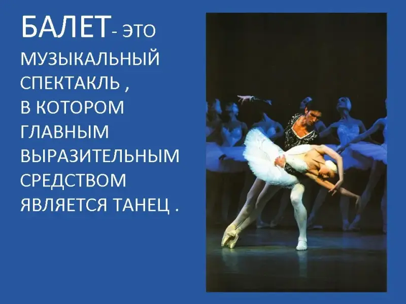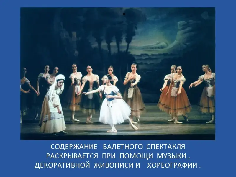 б) в балетном спектакле нет слов, но выразительные танцевальные движения способны передать самое разнообразное содержание: от сказки до трагедии, от романтической поэмы до комедии.