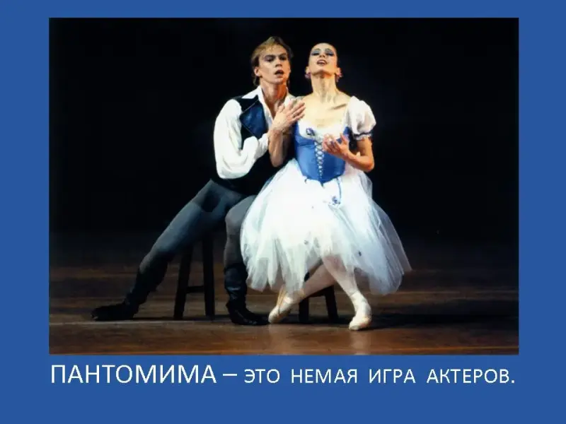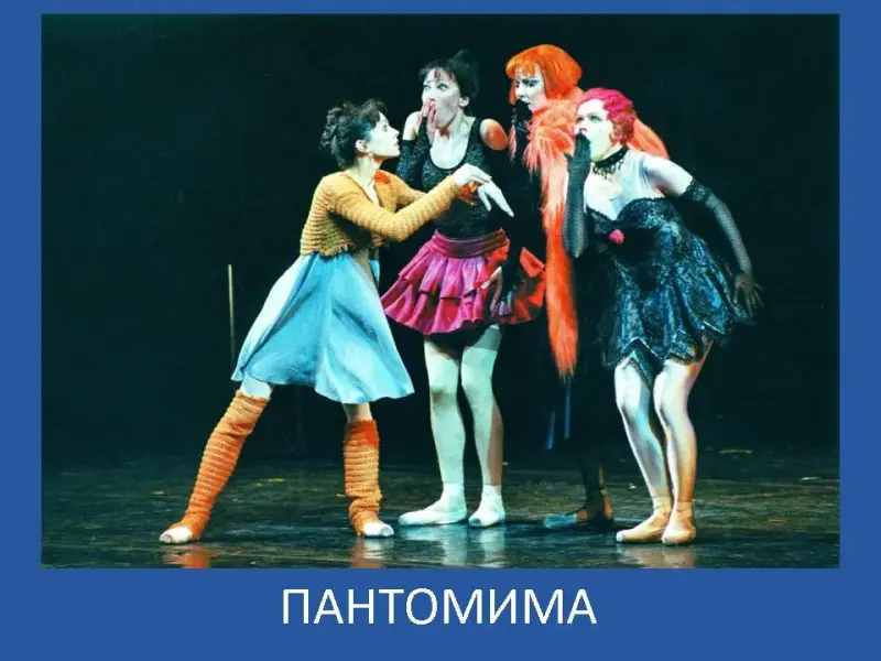В пантомиме (по греч. «все воспроизводящий подражанием») танцоры жестами и мимикой передают разговор действующих лиц. Музыка пантомимы более свободна по ритму и создает ощущение выразительных