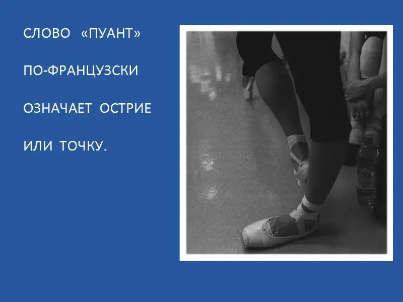 5. Беседа о том, кто такие балерины, о трудности освоения танцевальной техники, о том, почему балет называют «танцем на пуантах», о балетных туфлях (пуантах), позволяющих танец балерины сделать легким и воздушным. (Слайды 14,15,16)