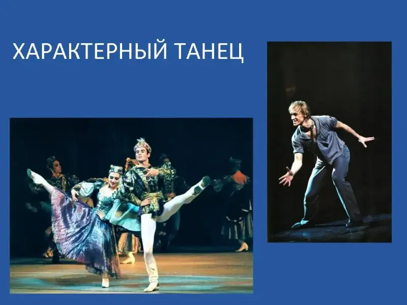 К характерным танцам относятся национальные и народные танцы, переработанные для исполнения в балетном спектакле. (Слайды 21, 22)