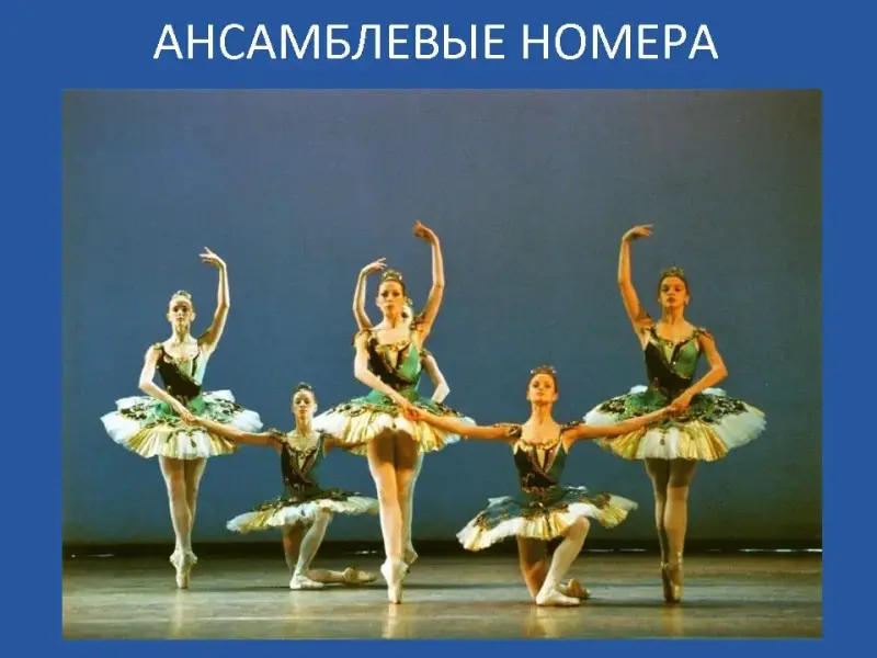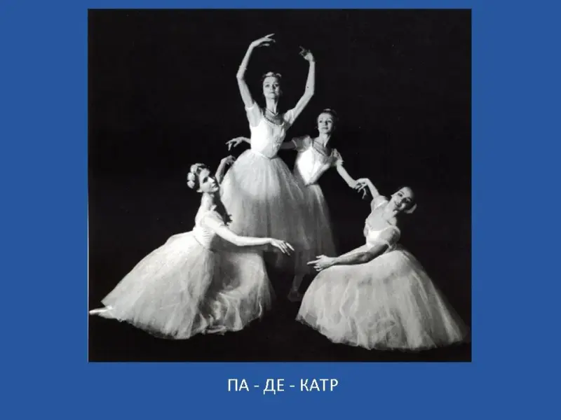 Танцы в балете бывают сольные (выходы, вариации), ансамблевые (танец двоих - pas de deux , танец троих - pas de trios, танец четырех - pas de quatre) и групповые - массовые (номера исполняет