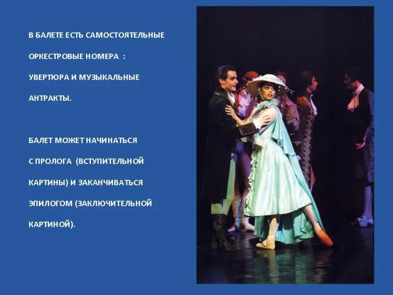 музыкальный антракт является вступлением к какому-либо акту (действию) балета. Балетный спектакль может начинаться с пролога, а заканчиваться эпилогом. (Слайд 31)