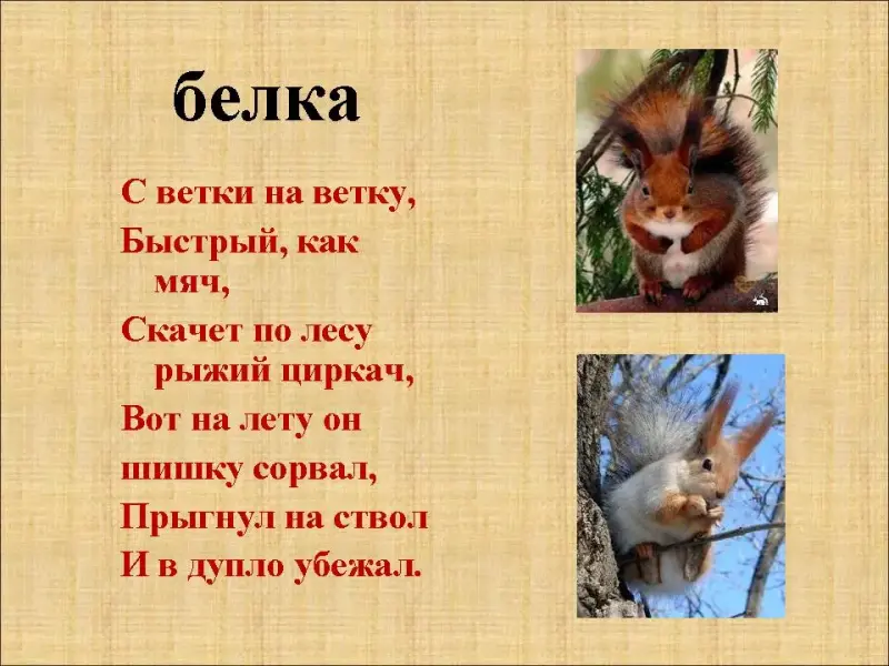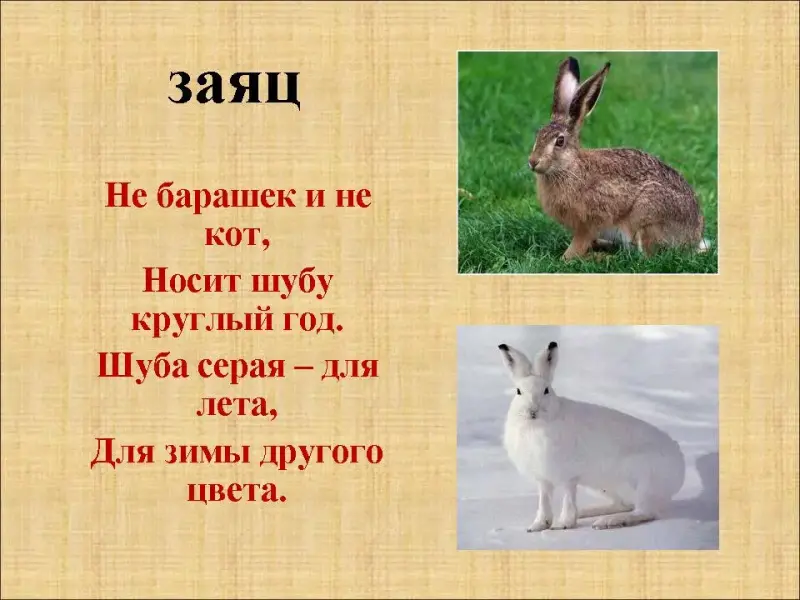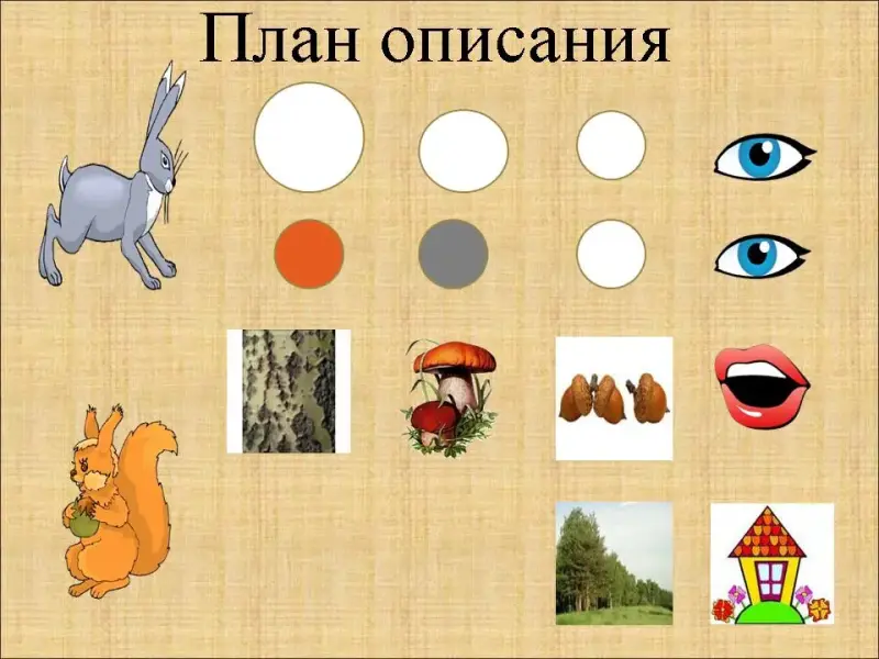 Дети: Зайчик и белочка среднего размера. Зайчик летом серый, а белочка рыжая. Зимой заяц белый, а белочка серая. Заяц питается корой деревьев, а белка жёлудями, грибами. Они живут в лесу. Это дикие животные.