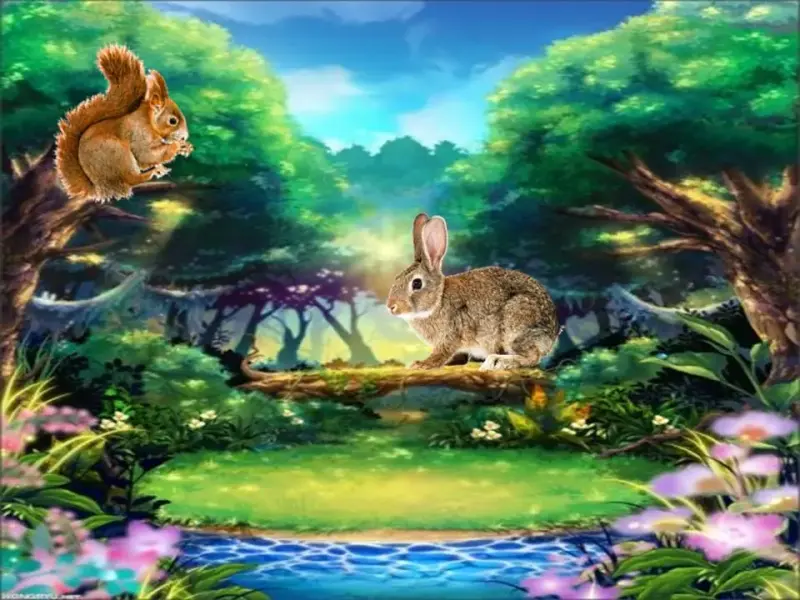 Встретились на лесной полянке белочка и зайчик и залюбовались друг другом. Белочка была рыженькая, а зайчик был серенький. Ушки у белочки маленькие, остренькие, с кисточками на концах. А у зайчика