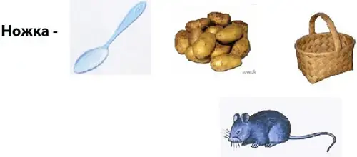 б) Следующий шаг предполагает использование приёма исключения четвёртого лишнего слова, не являющегося рифмой: ножка - ложка, картошка, лукошко, мышка.