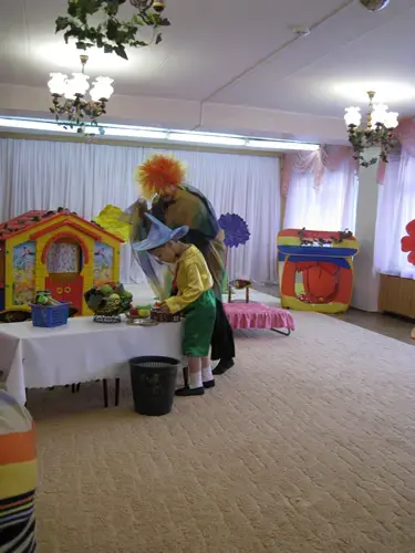 Незнайка бросает в корзину прыгалки. Берет овощи, чтобы съесть.