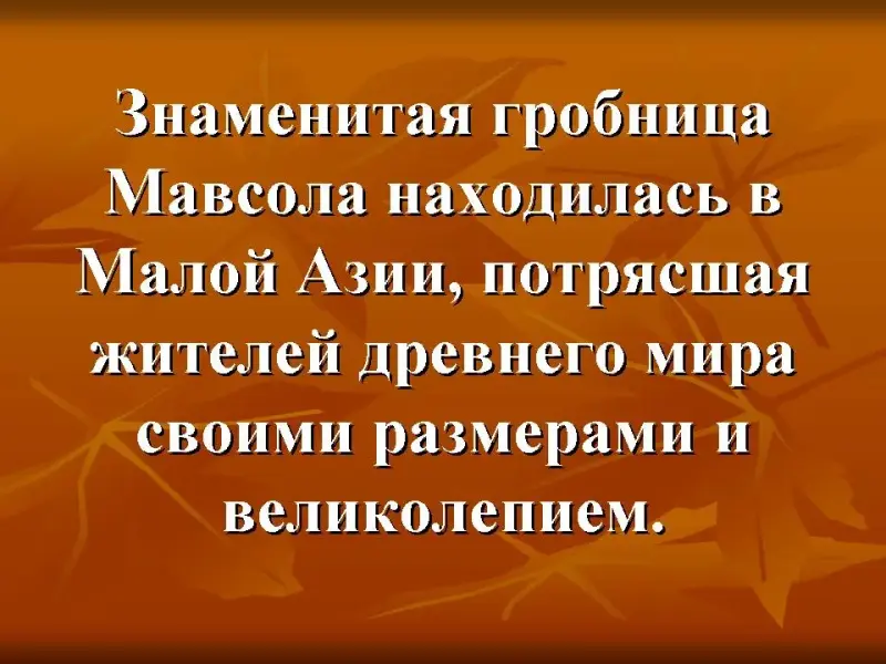 Знаменитая гробница Мавсола находилась в Малой Азии, потрясшая жителей древнего мира своими размерами и великолепием. Знаменитая гробница Мавсола, потрясшая жителей древнего мира
