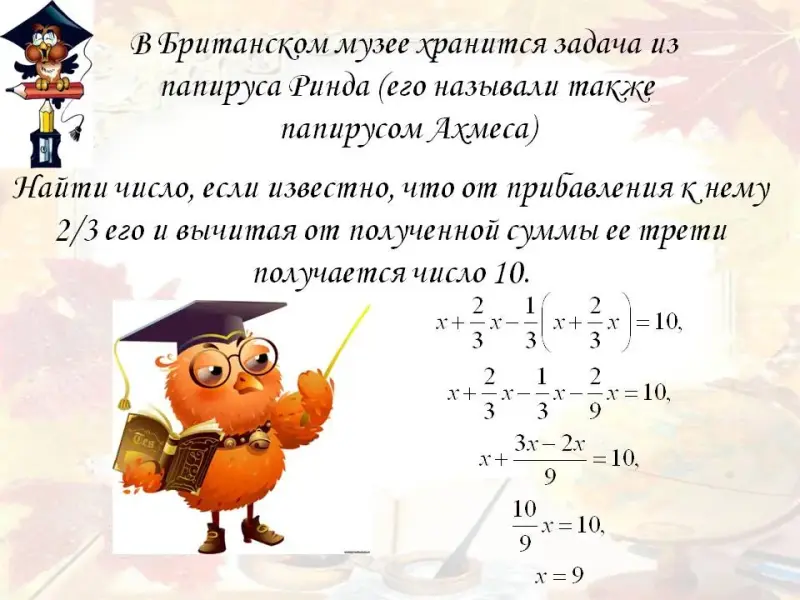 Около 4000 лет назад в Вавилоне и в Египте ученые уже умели составлять линейные уравнения, с помощью которых они решали самые разнообразные задачи землемерия, строительного искусства и военного дела. Например, в Британском музее хранится задача из папируса Ринда (его называли также папирусом Ахмеса), относящегося к периоду 2000 - 1700 гг. до н. э.: «Найти число, если известно, что от прибавления к нему 2/3 его и вычитания от полученной суммы ее трети получается число 10». Решение этой задачи сводится к решению линейного уравнения: