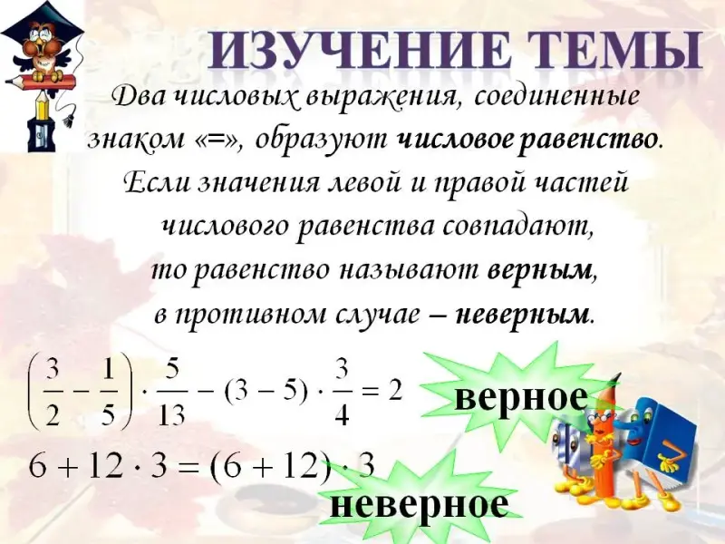 Определение 3: Два числовых выражения, соединенные знаком «=», образуют числовое равенство. Если значения левой и правой частей числового равенства совпадают, то равенство называют верным, в противном случае - неверным.