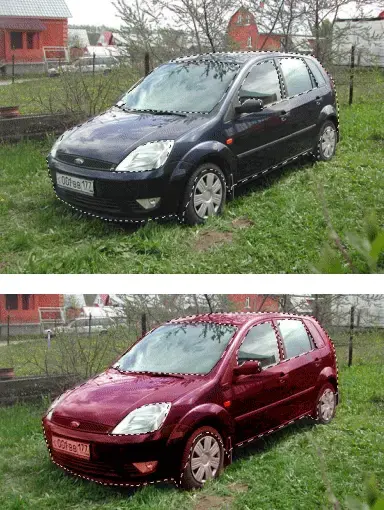 1. Начнём с "перекраски" нашего автомобиля. Откроем файл рисунок 1. Выделим автомобиль с помощью инструмента прямолинейное Лассо. Для этого отметим множество опорных точек, выделим только корпус автомобиля без фар, без стекол, без колёс (лассо в режиме вычитания выделенной области).