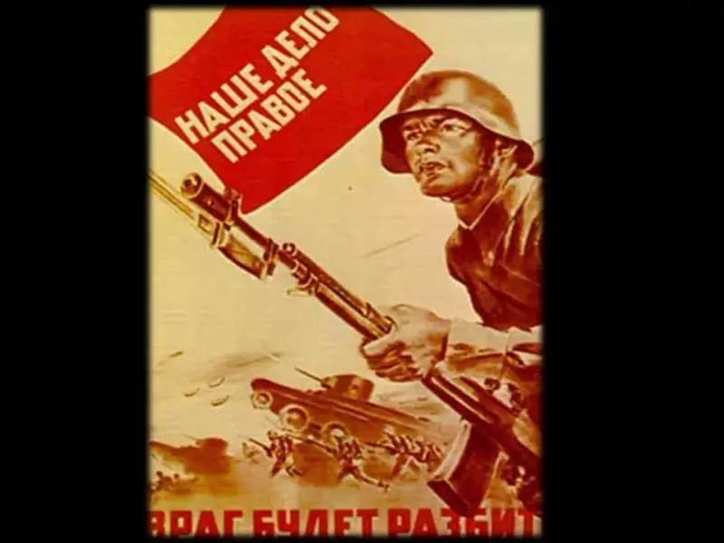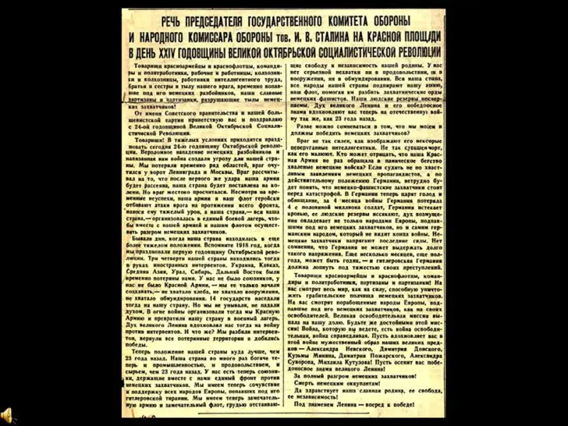 В 12 часов дня по радио было передано важное правительственное заявление. Заместитель Председателя Совета народных комиссаров Союза ССР и народный комиссар иностранных дел Вячеслав Михайлович Молотов призвал к (Слайд 8) "Отечественной войне за Родину, за честь, за свободу". Свою речь он завершил знаменитыми словами: "Наше дело правое. Враг будет разбит. Победа будет за нами!". (Слайд 9)