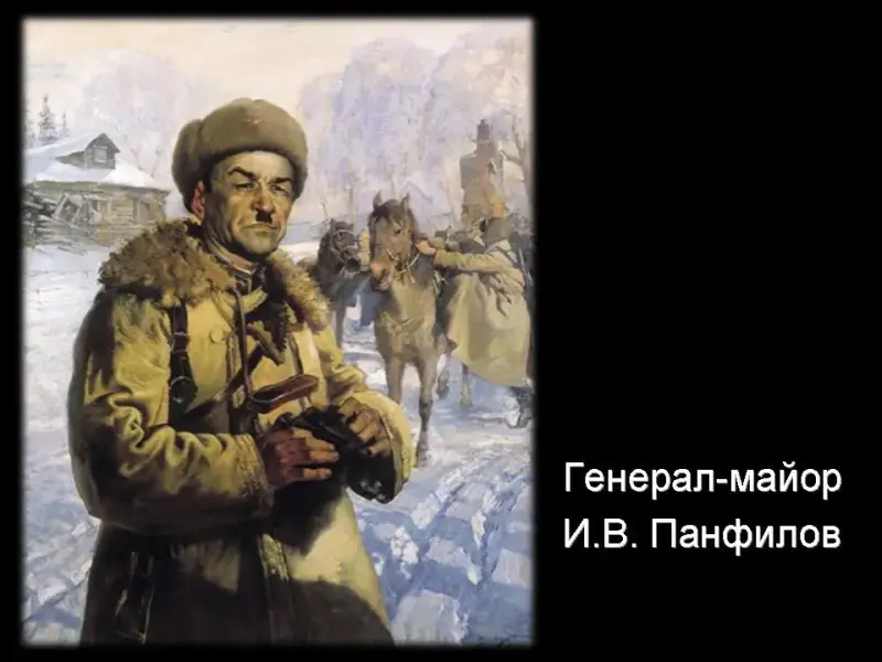 2 ведущий: Особенно упорный характер бои носили в районе Волоколамска. Здесь оборонялась 16-я армия, в состав которой входила 316-я стрелковая дивизия во главе с генерал-майором И. В. Панфиловым. (Слайд 21)