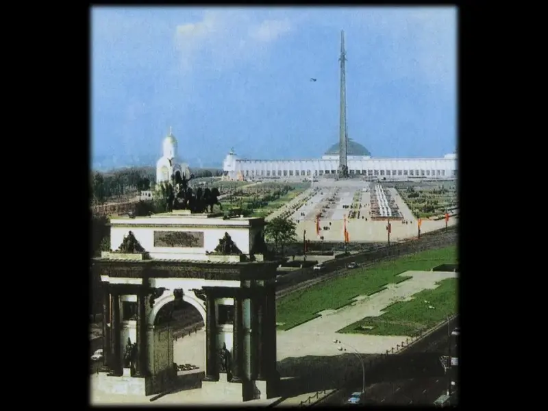 К сожалению, Поклонная гора больше не возвышается, как прежде, над окрестностями. В последние 100 лет в этой местности много строили, и в конце концов гору срыли. Но название ее сохранилось. На Поклонной горе находятся Парк Победы и Мемориал победы в Великой Отечественной войне. (Слайд 51)