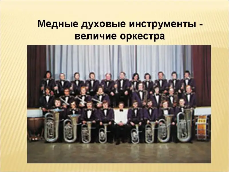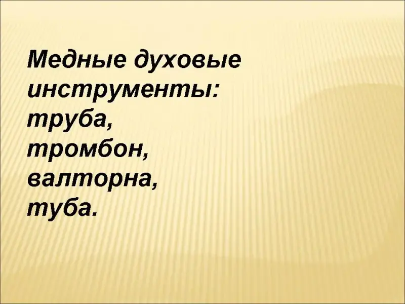 - Совершенно верно, ребята. Группа духовых инструментов делится на деревянные и медные духовые инструменты. И мы сейчас познакомимся с группой медных духовых инструментов.