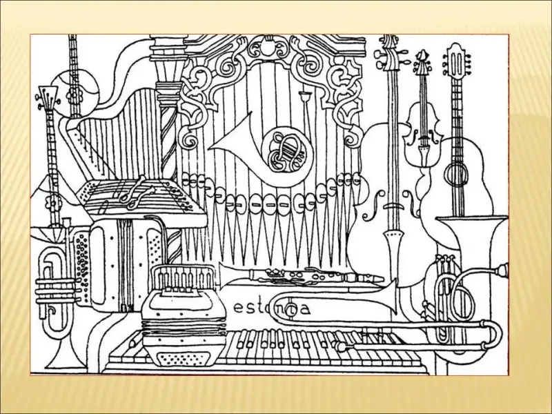 Задача: Найти на рисунке изображения медных духовых инструментов симфонического оркестра и раскрасить их.