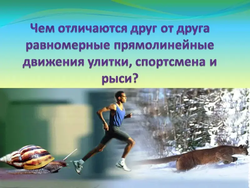 - Чем отличаются друг от друга равномерные прямолинейные движения улитки, спортсмена и рыси? (слайд 3)