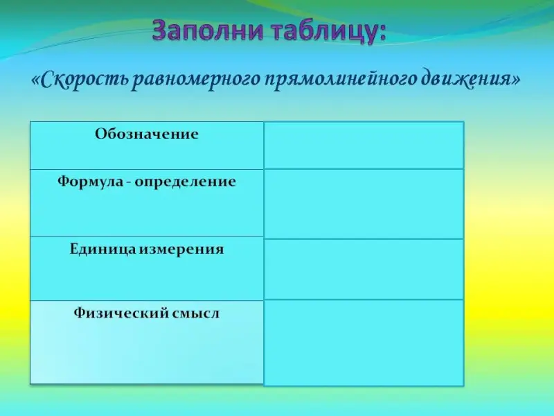 - Вспомните основные понятия скорости равномерного прямолинейного движения. Заполните таблицу (обозначение, формула-определение, единица измерения, физические смысл) (слайд 5).