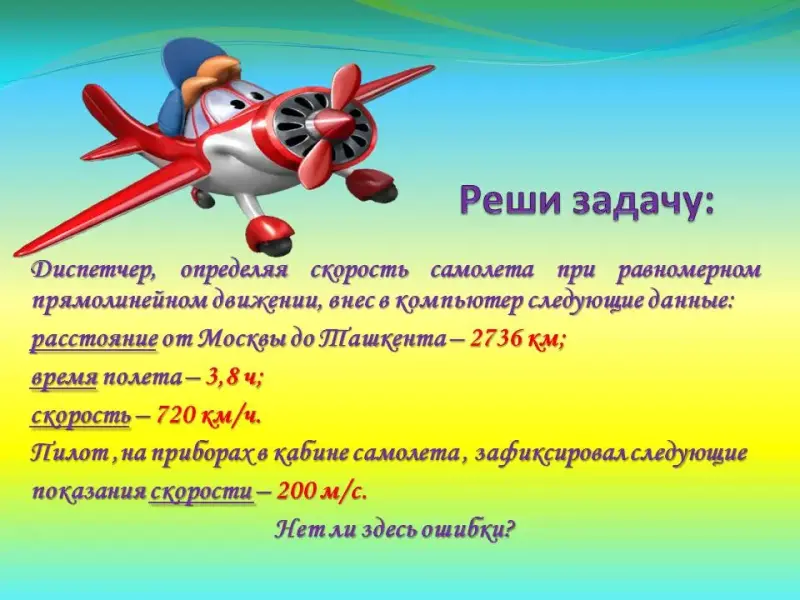 - Решите задачу: «Диспетчер, определяя скорость самолета при равномерном прямолинейном движении, внес в компьютер следующие данные: расстояние от Москвы до Ташкента - 2736 км; время полета - 3,8 ч; скорость - 720 км/ч. Пилот, на приборах в кабине самолета, зафиксировал следующие показания скорости - 200 м/с. Нет ли здесь ошибки?» (слайд 6)