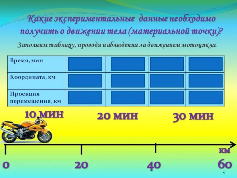 Давайте и мы, наблюдая за движением мотоцикла, получим необходимые экспериментальные данные и заполним таблицу (слайд 9).