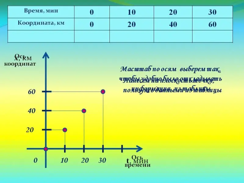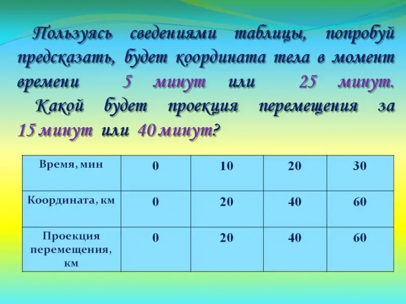 - Пользуясь сведениями таблицы, попробуй предсказать, будет координата тела в момент времени 5 минут или 25 минут. Какой будет проекция перемещения за 15 минут или 40 минут? (слайд 10)