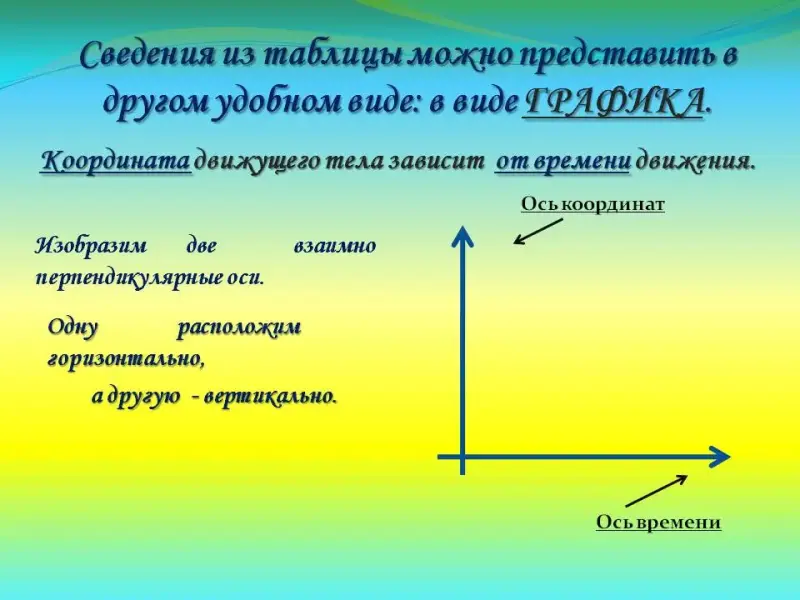 Сведения из таблицы можно представить в другом удобном виде: в виде ГРАФИКА. Для этого вспомним, что координата движущего тела зависит от времени движения. (слайд 11) Изобразим две взаимно перпендикулярные оси. Одну расположим горизонтально, а другую - вертикально. По горизонтальной оси будем откладывать время в минутах, а по вертикальной - координату тела в километрах. (слайд 12) Масштаб по осям выберем так, чтобы удобно было считать информацию.