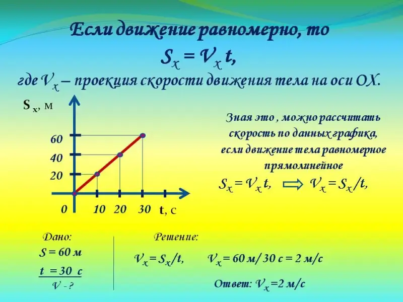 Мы знаем, что если движение равномерно, то перемещение (или расстояние) можно рассчитать по формуле Sx = Vx t, где Vx - проекция скорости движения тела на оси ОХ.(слайд 17).