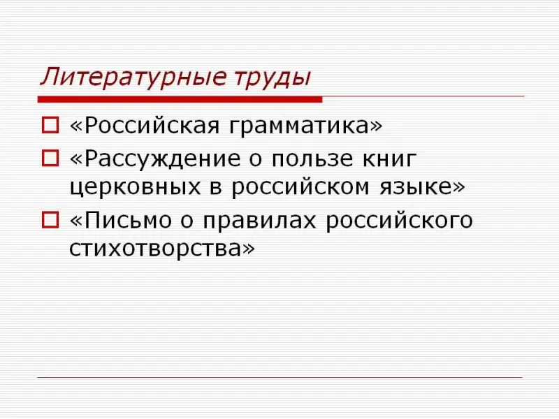 Старославянскими называют слова и части слов, пришедшие из старославянского, древнего языка славян. В конце X века (после принятия христианства) распространился на Руси. Затем, подвергшись языковому и грамматическому влиянию русского языка, получил название церковно-славянского и до VII века употреблялся как одна из разновидностей русского литературного языка. Возникло резкое различие между языком «книги» и живым говором народа. Наш герой осознаёт, что литература не может идти вперёд без формальной правильности в языке и стихе, без литературных форм. Важнейшими трудами этого рода были: «Российская грамматика», где проводится резкая грань между языками русским и церковно-славянским; «Рассуждение о пользе книг церковных в российском языке», «Письмо о правилах российского стихотворства». Своими реформами учёный открыл перед поэзией широкие художественные горизонты.