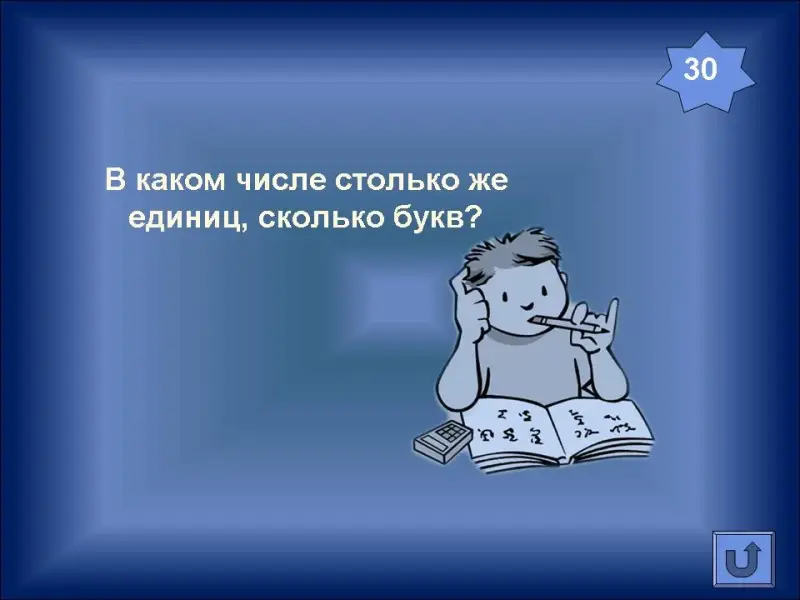 | ЗАГАДКИ | 30 | В каком числе столько же единиц, сколько букв? |