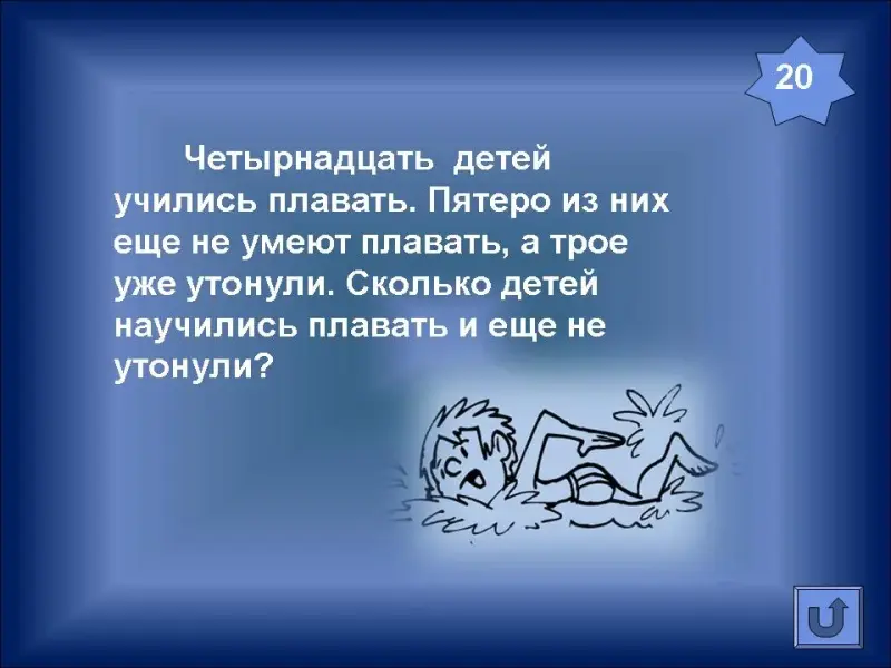 | ДЕТИ | 20 | Четырнадцать детей учились плавать. Пятеро из них еще не умеют плавать, а трое уже утонули. Сколько детей уже научились плавать и еще не утонули? |