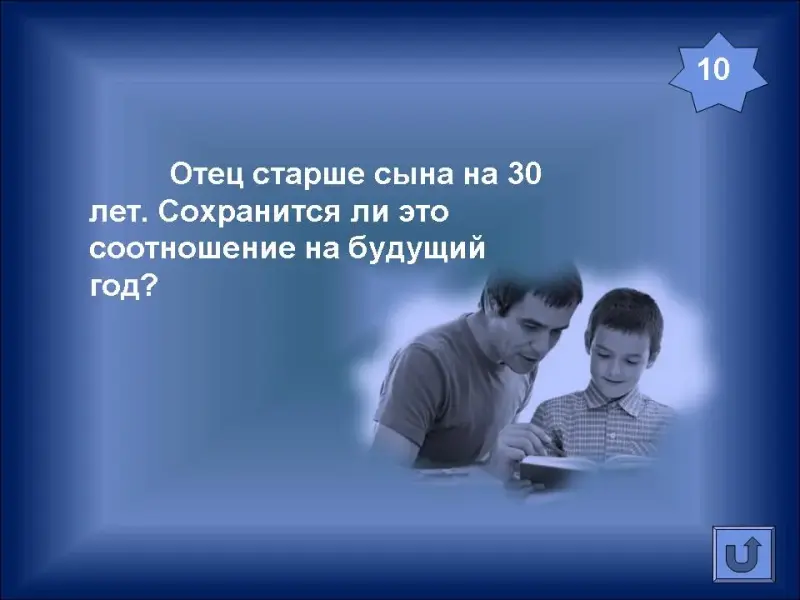 | КАЛЕНДАРЬ | 10 | Отец старше сына на 30 лет. Сохранится ли это соотношение на будущий год? |