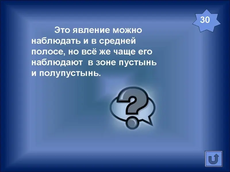 | ЯВЛЕНИЯ | 30 | Это явление можно наблюдать и в средней полосе, но чаще его наблюдают в зоне пустынь и полупустынь. |