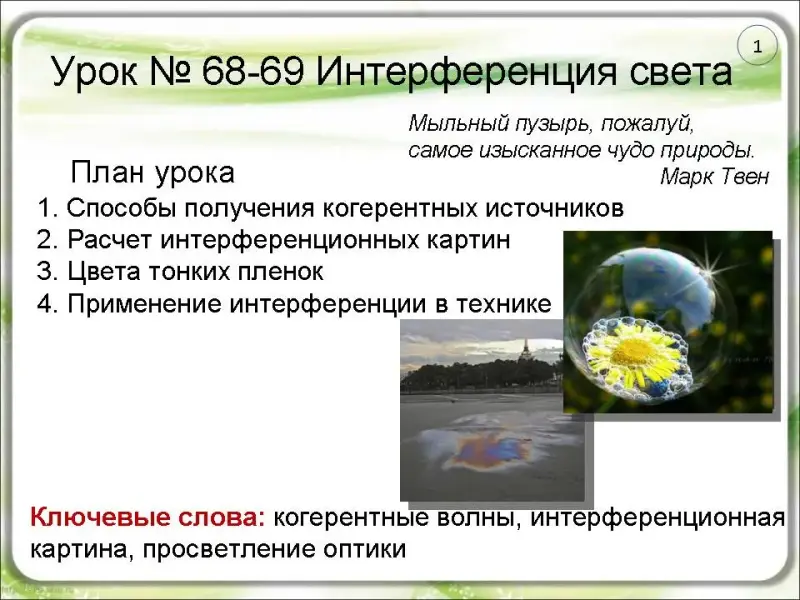 всеми оттенками цветов, присущим окружающим предметам. Мыльный пузырь, пожалуй, самое изысканное чудо природы». Именно интерференция делает мыльный пузырь достойным восхищения (слайд 1).
