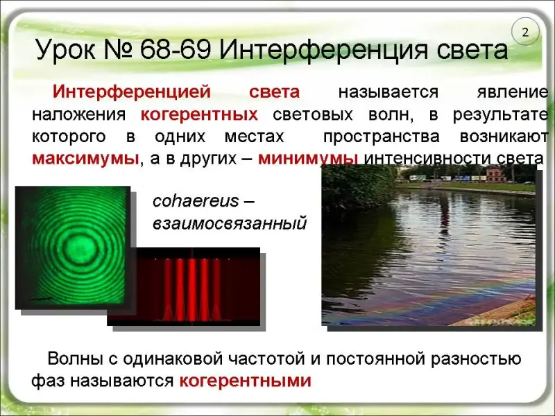 2. Какие волны называются когерентными? (слайд 2). (Волны с одинаковой частотой и постоянной разностью фаз называются когерентными).